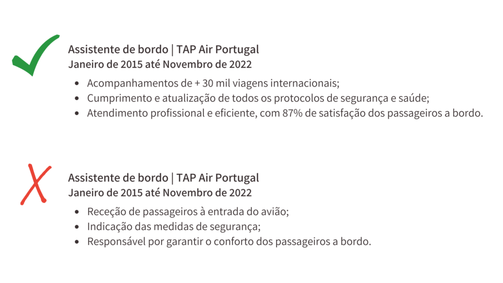 Não, o que se pretende saber é de que forma desempenhou essas tarefas, quais as conquistas e resultados que alcançou. Mas não liste qualquer conquista, liste aquela que vai fazer a diferença para o cargo a que se candidata.